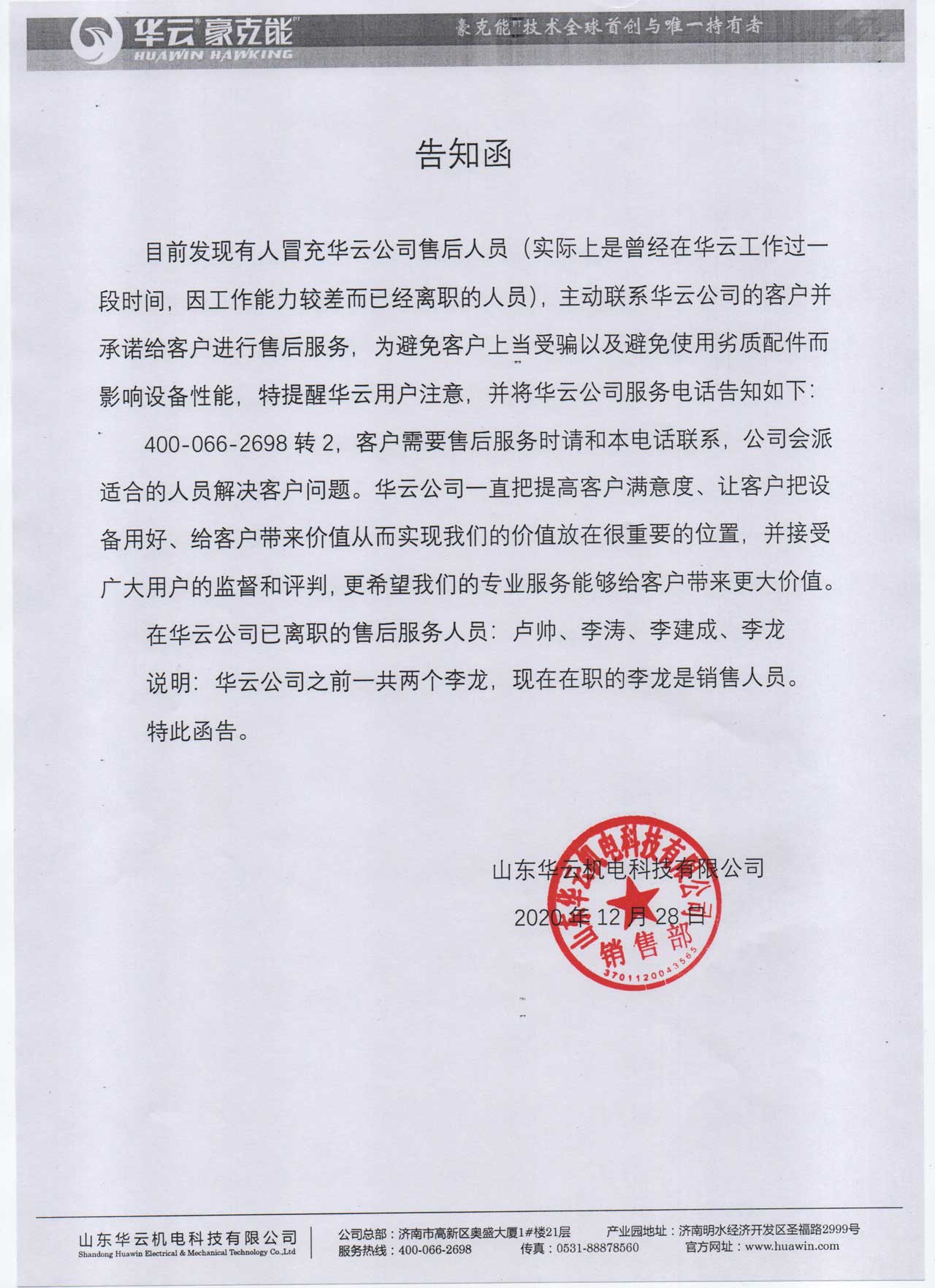 尊敬的华云客户,目前发现有人冒充我公司售后人员(实际是曾经在华云工作过,因工作能力较差早已离职的人员),主动联系华云公司的客户并承诺给客户进行售后服务,为避免客户上当受骗以及避免使用劣质配件而影响设备性能,特提醒广大华云用户注意并将华亿手机版_华亿(中国)公司服务电话告知如下:
